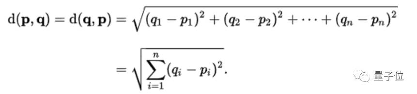 对,没错。我们可以用欧氏距离(也称欧几里德度量),如图1.5所示。我们高中所学的两点距离公式就是欧氏距离在二维空间上的公式,也就是欧氏距离的n的值为2的情况。