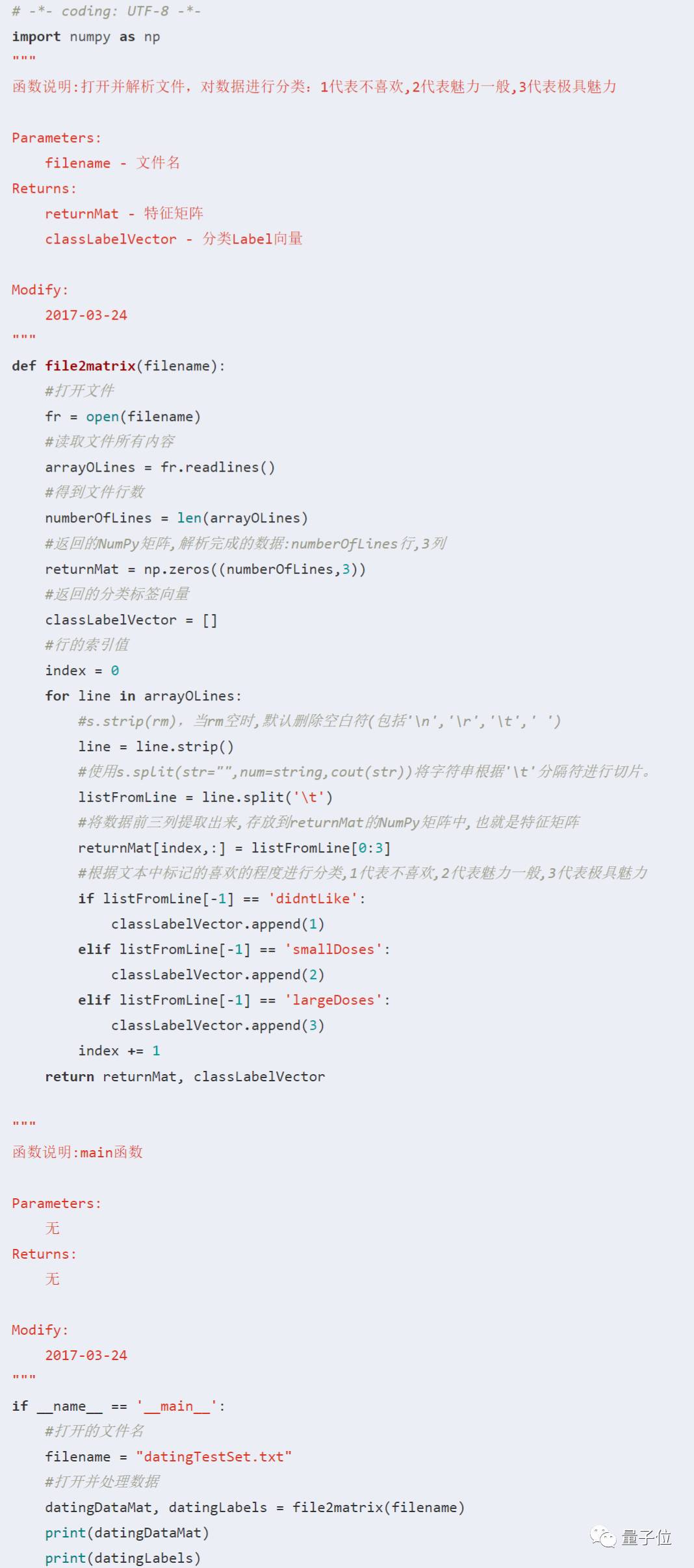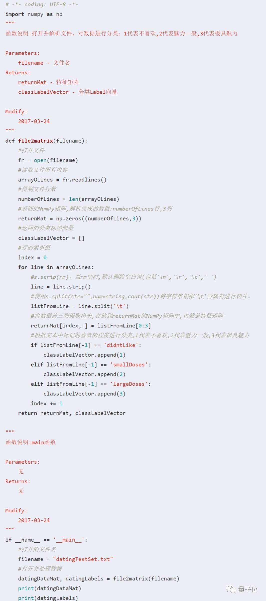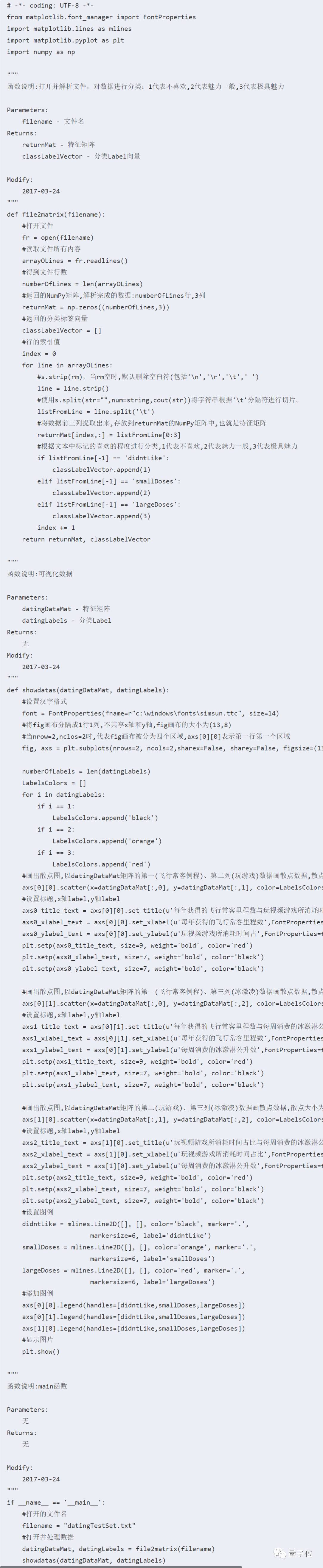 需要注意的是,10%的测试数据应该是随机选择的,由于海伦提供的数据并没有按照特定目的来排序,所以我么你可以随意选择10%数据而不影响其随机性。