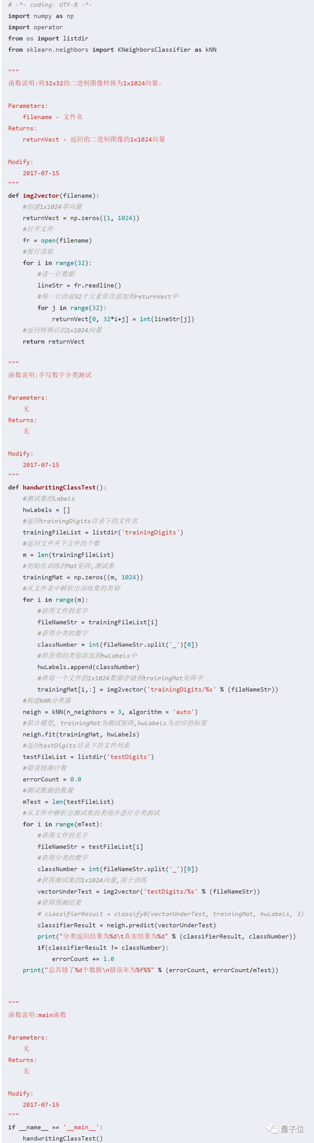 对于这样已经整理好的文本,我们可以直接使用Python处理,进行数字预测。数据集分为训练集和测试集,使用上小结的方法,自己设计k-近邻算法分类器,可以实现分类。数据集和实现
