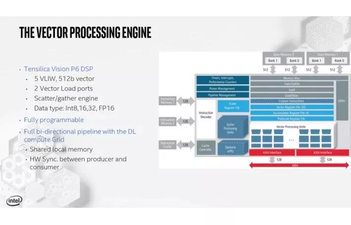 这里我们可以看到DL Compute Grid的特写视图,它被设计得很灵活,以最大化其4D并行计算能力,以及用于矢量处理的Tensilicon Vision P6 DSP。Tensilica DSP引擎是一个广泛的VLIW机器,支持INT8, 16, 32,和FP16。该引擎是完全可编程的,并具有一个双向管道和DL Compute Grid,可在两个硬件同步单元之间快速传输数据。。