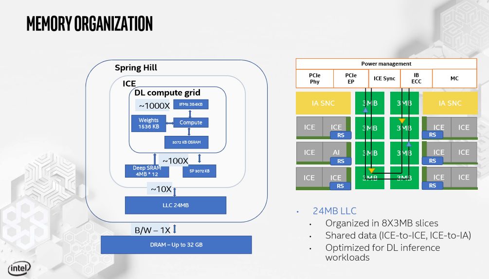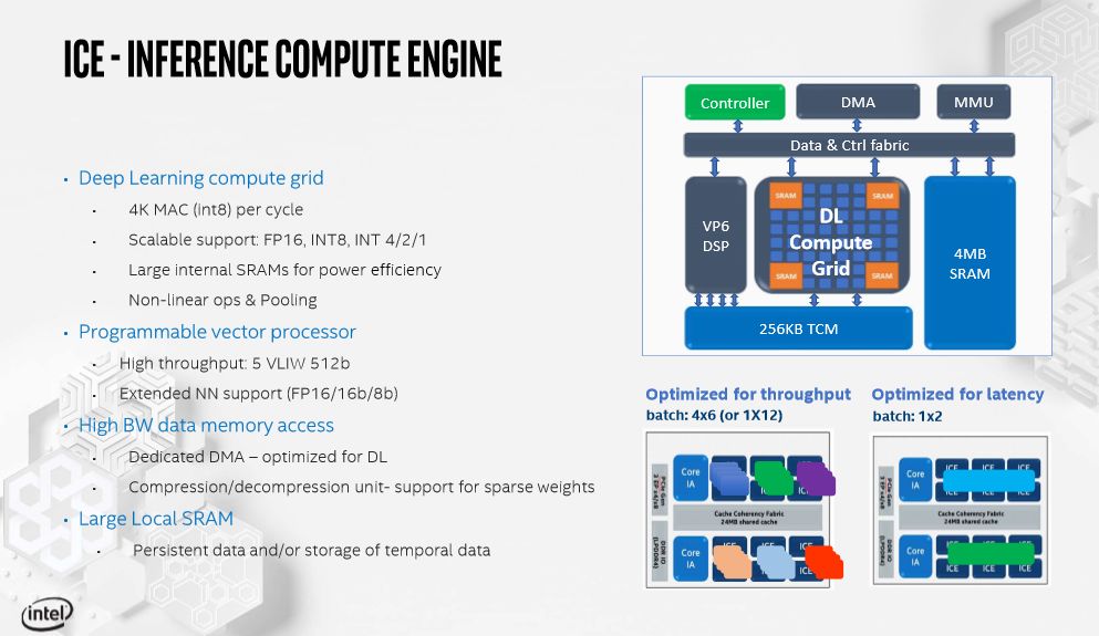 英特尔修改了10nm Ice Lake处理器,去掉了两个计算核心和图形引擎,以适应12个推理计算引擎(ICE)。ICE加速器具有基于硬件的单元间同步,与两个IA核共享一个连贯的结构和24MB的L3缓存,这两个IA核具有Sunny Cove微架构。