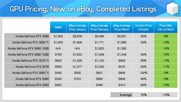 有外媒也统计了 eBay 上所有在售显卡的价格走势,对照 3 月中旬与 2 月的情况发现,所有显卡皆有不同程度的降价,最多跌幅超过 20%,平均亦有 8.8%。此前,2 月的价格已较 1 月下跌 11%,自去年 12 月以来,整体平均跌幅已达 25%。