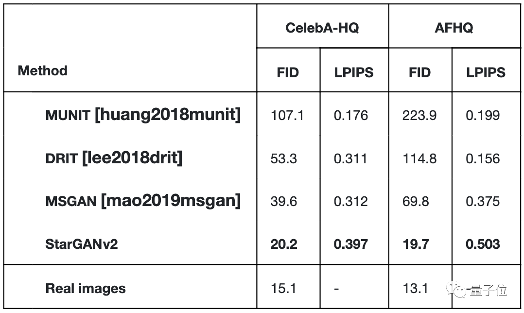他们还把四种模型生成的图像上传到AMT平台,交给人工评选,绝大部分测试者都认为StarGANv2生成的图片更优质。