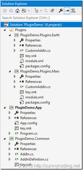 注意:除了PluginDemo.Common之外的其它三个项目,都对PluginDemo.Common有引用关系。而PluginDemo.App项目仅仅在项目本身依赖于PluginDemo.Plugins.Earth和PluginDemo.Plugins.Mars,它不会去引用这两个项目。