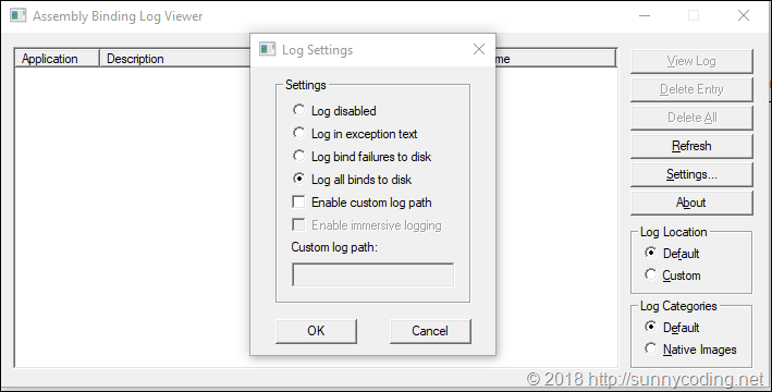 在.NET SDK中带了一个fuslogvw.exe的应用程序,通过它可以查看详细的Assembly加载过程。使用方法非常简单,使用管理员身份启动Visual Studio 2017 Developer Command Prompt,然后在命令行输入fuslogvw.exe,即可启动日志查看器。启动之后,点击Settings按钮,以启用日志记录功能:
