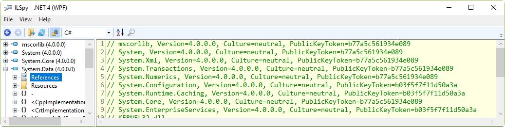 在一个Assembly被编译的时候,它所引用的Assembly的全名(FullName)就会被编译器强行写入Assembly的Metadata,这个值是死的,从ILSpy可以看到,每个Reference都有它的全名信息: