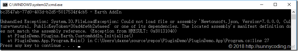 目前没有什么问题。接下来,对两个AddIn分别做一些修改。让这两个AddIn依赖于不同版本的Newtonsoft.Json,比如,Earth依赖于7.0.0.0的版本,Mars依赖于6.0.0.0的版本,然后分别修改两个CustomAddIn的Initialize方法,在方法中各自调用一次JsonConvert.SerializeObject方法,以触发Newtonsoft.Json这个Assembly的加载。此时再次运行程序,你将看到下面的异常: