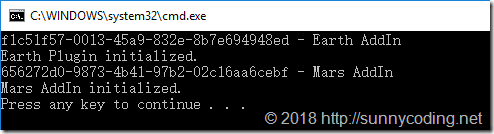 为了简单直观,我把这个插件系统称为PluginDemo。这个插件很简单,主体程序是一个控制台应用程序,然后我们实现两个插件:Earth和Mars,在不同的插件的Initialize方法中,会输出不同的字符串。