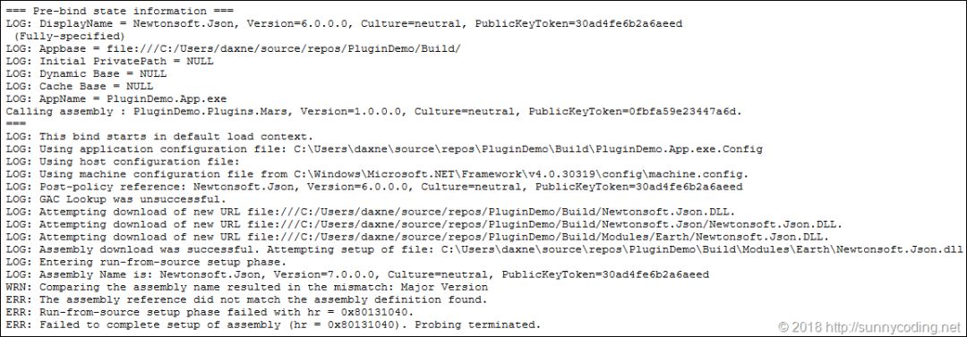 然后,通过App.config中的probing的privatePath设定,首先查找Modules\Earth目录(因为这个目录放在privatePath的第一个),找到了一个叫做Newtonsoft.Json.dll的Assembly,于是,判断版本是否相同。结果,找到的是7.0.0.0,而它需要的却是6.0.0.0,版本不匹配,于是就抛出异常,退出程序