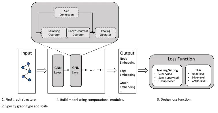 GNN 是基于图的深度学习方法,作为神经模型的一种,它通过图节点之间的消息传递来捕获图的依赖性。GNN 的设计流程通常包含四个步骤:找出相应的图结构、指定图类型与规模、设计损失函数、使用计算模块构建模型。