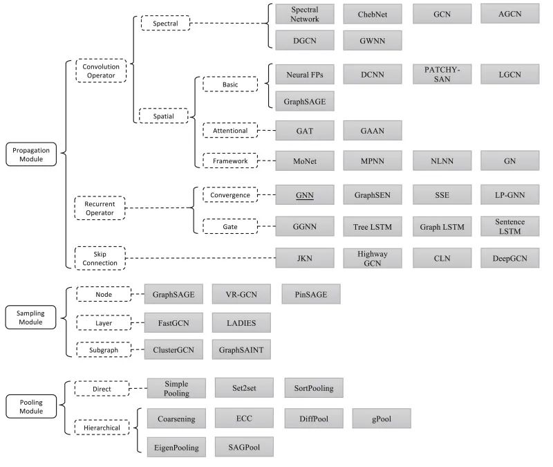 :常用的计算模块有传播模块、采样模块、池化模块。传播模块用于在节点之间传播信息,以便聚合信息可以捕获特征和拓扑信息。当图很大时,通常需要采样模块对图进行传播。如果需要高级子图或图的表示,则需要池化模块从节点中提取信息。