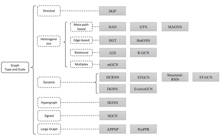 :在获得图形后,需要找出图形类型及其规模。图通常分为有向 / 无向图、同构 / 异构图(同构图中的节点和边具有相同的类型,而异构图中的节点和边具有不同的类型)、静态 / 动态图(当输入特征或图的拓扑随时间变化时,该图被视为动态图)。