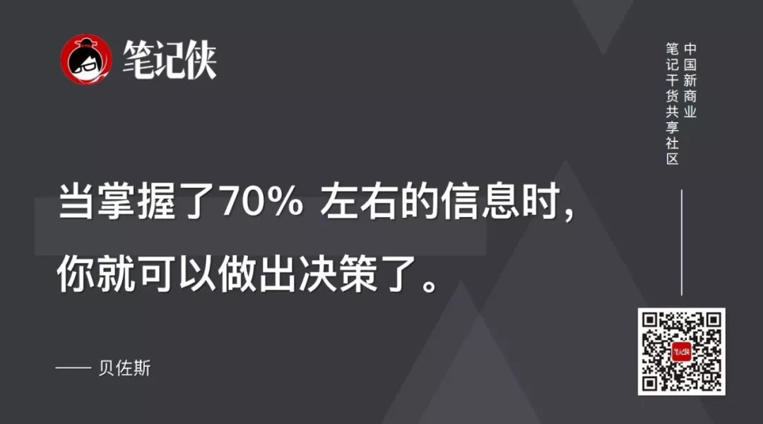 贝佐斯说过,当掌握了70% 左右的信息时,你就可以做出决策了。如果等到掌握了90%的信息再做决定,大多数情况下可能已经晚了。