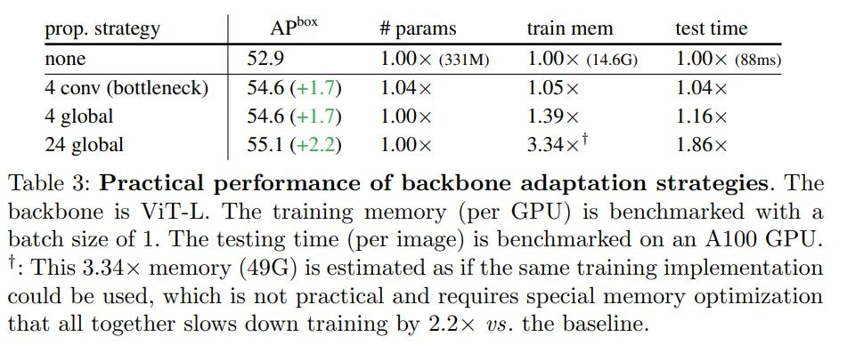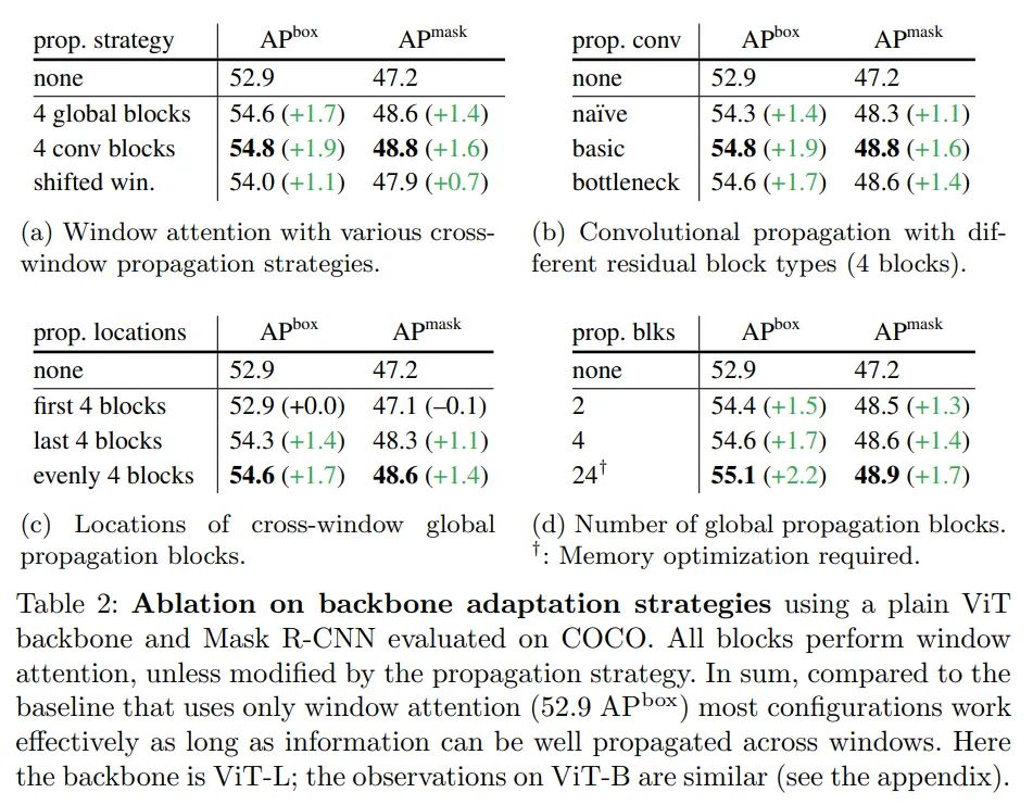 2、在几个传播块的帮助下,窗口注意力就足够了。表 2 总结了本文提出的主干调整方法。简而言之,与只有窗口注意力、无跨窗口传播块的基线(图中的「none」)相比,各种传播方式都可以带来可观的收益。