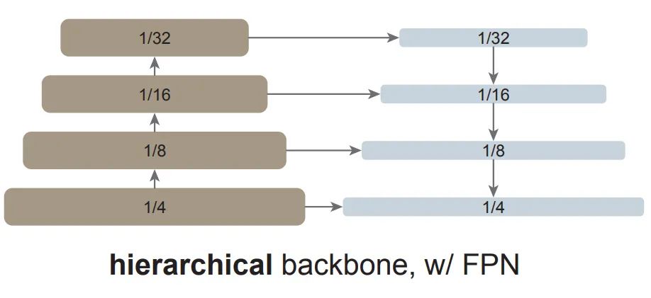 FPN 是构建用于目标检测的 in-network 金字塔的常见解决方案。如果主干网络是分层的,FPN 的动机就是将早期高分辨率的特征和后期更强的特征结合起来。这在 FPN 中是通过自上而下(top-down)和横向连接来实现的,如图 1 左所示。