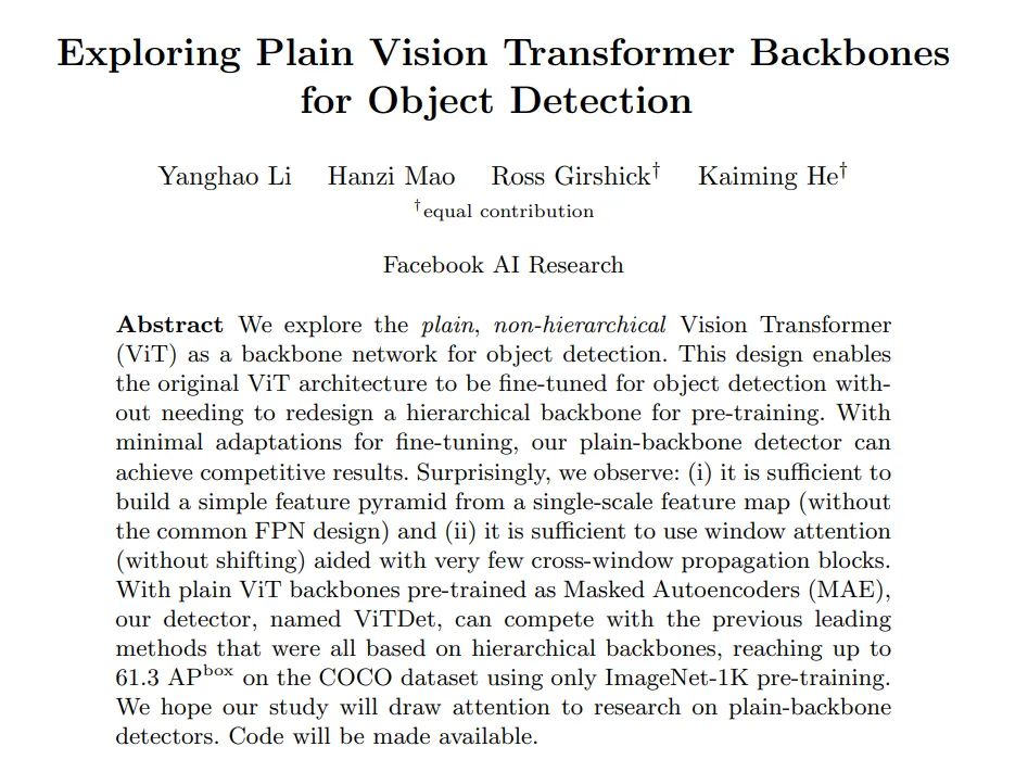 做目标检测就一定需要 FPN 吗?昨天,来自 Facebook AI Research 的 Yanghao Li、何恺明等研究者在 arXiv 上上传了一篇新论文,证明了将普通的、非分层的视觉 Transformer 作为主干网络进行目标检测的可行性。他们希望这项研究能够引起大家对普通主干检测器的关注。 >>加入极市CV技术交流群,走在计算机视觉的最前沿