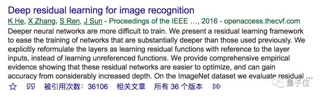 另外,CVPR 2016最佳论文Deep Residual Learning for Image Recognition,引用次数也超过了36000。