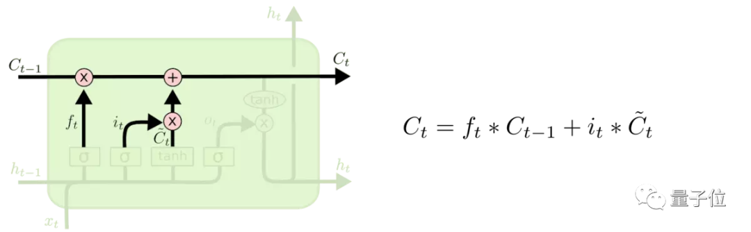 把旧状态与ft相乘,丢弃掉确定需要丢弃的信息,再加上经过筛选后的新信息,就得到了当前cell的状态。