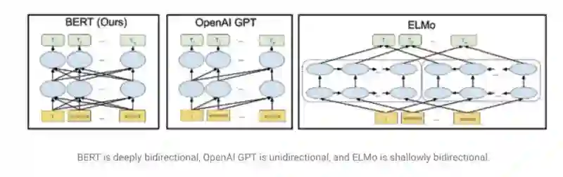 (图)BERT是深度双向的,OpenAI GPT是单向的,而ELMo是浅双向的