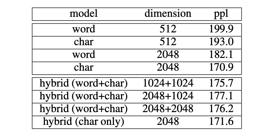 实验中,对比了不同维度下,单独的 word、char 模型和混合模型的效果。可以发现,char 模型的效果都优于 word 模型,维度为 2048 时,ppl 达到最优的结果差距明显 。作者在标准 CWS 包和 LTP 包也进行了实验,并获得了相同的结果。