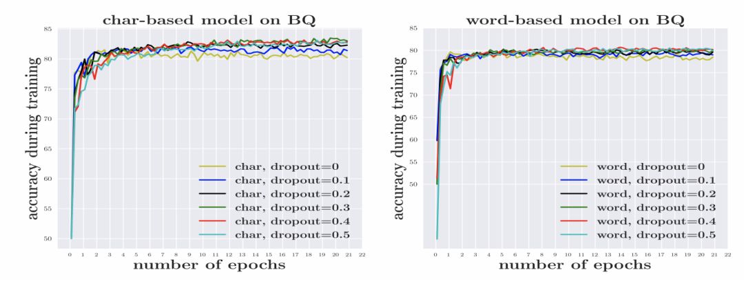 数据稀疏导致模型需要学习的参数增加,使得模型更加容易过拟合。本文在 BQ 数据集上进行了实验,结果如图1所示。要获得与基于词语的模型相似的效果,基于词语的模型需要设置更高的 dropout 值。