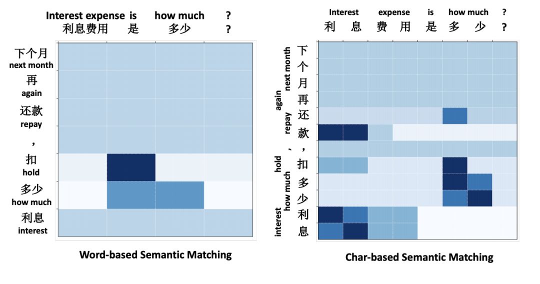 图4 基于词语和基于字符的模型对两个中文语句的语义匹配情况