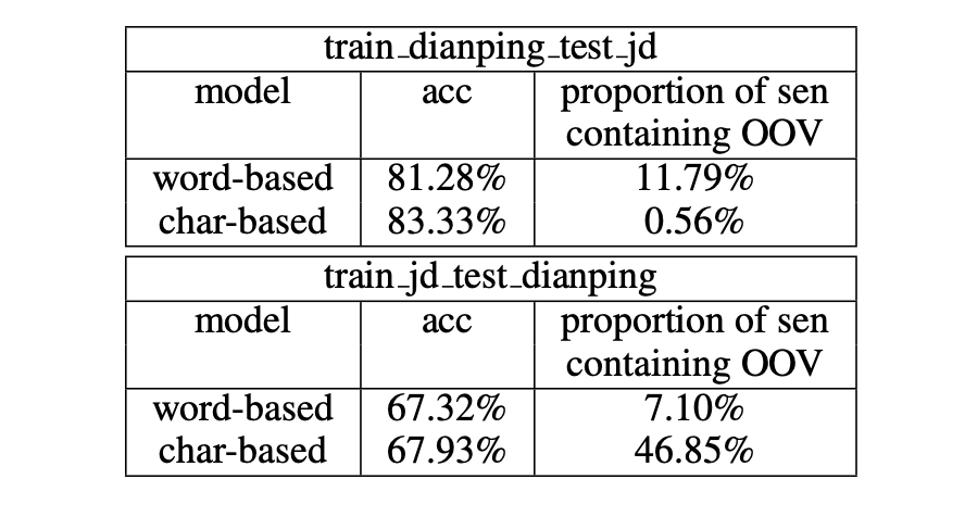 表8 基于字符的模型和基于词语的模型的领域适应能力