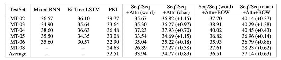 本部分评测使用中英翻译,使用语料为从 LDC 语料中抽取的125万个句子对。验证数据使用的是NIST 2002 ,测试数据使用的是NIST 2003,2004,2005,2006和2008。实验使用了出现频次最高的前30,000个英语词语,以及前27,500个中文词语。char model 的词语量设置为4500。作者对中译英和英译中两种任务都进行了评测,表4所示中译英结果,表5表示英译中结果。