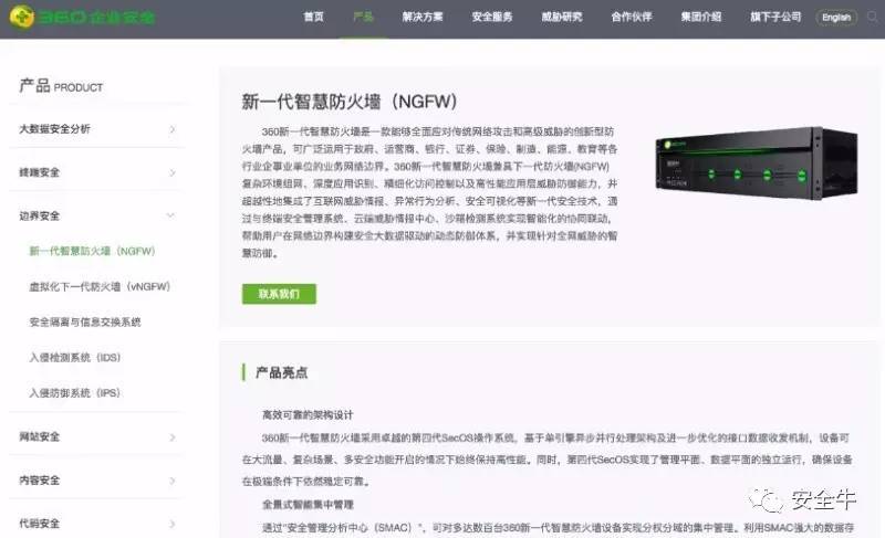 Gartner报告中谈到,“360 NSG系列防火墙产品支持通过SMAC管理平台进行集中管理,并且能够实时共享360互联网威胁情报中心生产的情报资源,同时还可以与360旗下的高级威胁防护、终端安全管理、沙箱检测等产品实现联动。此外,360虚拟化下一代防火墙已进驻阿里云和青云”。