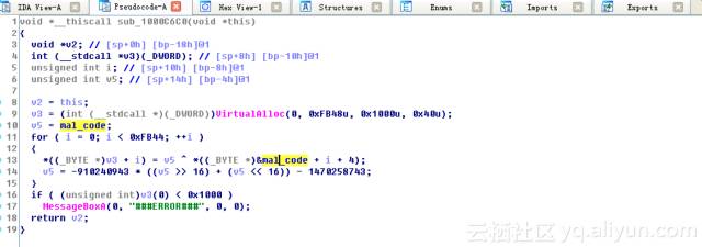 进一步分析这几个函数,主要功能是申请内存,解密一段”特殊代码”(暂定为mal_code),然后再执行该代码,这种行为通常是后门用来执行shellcode。