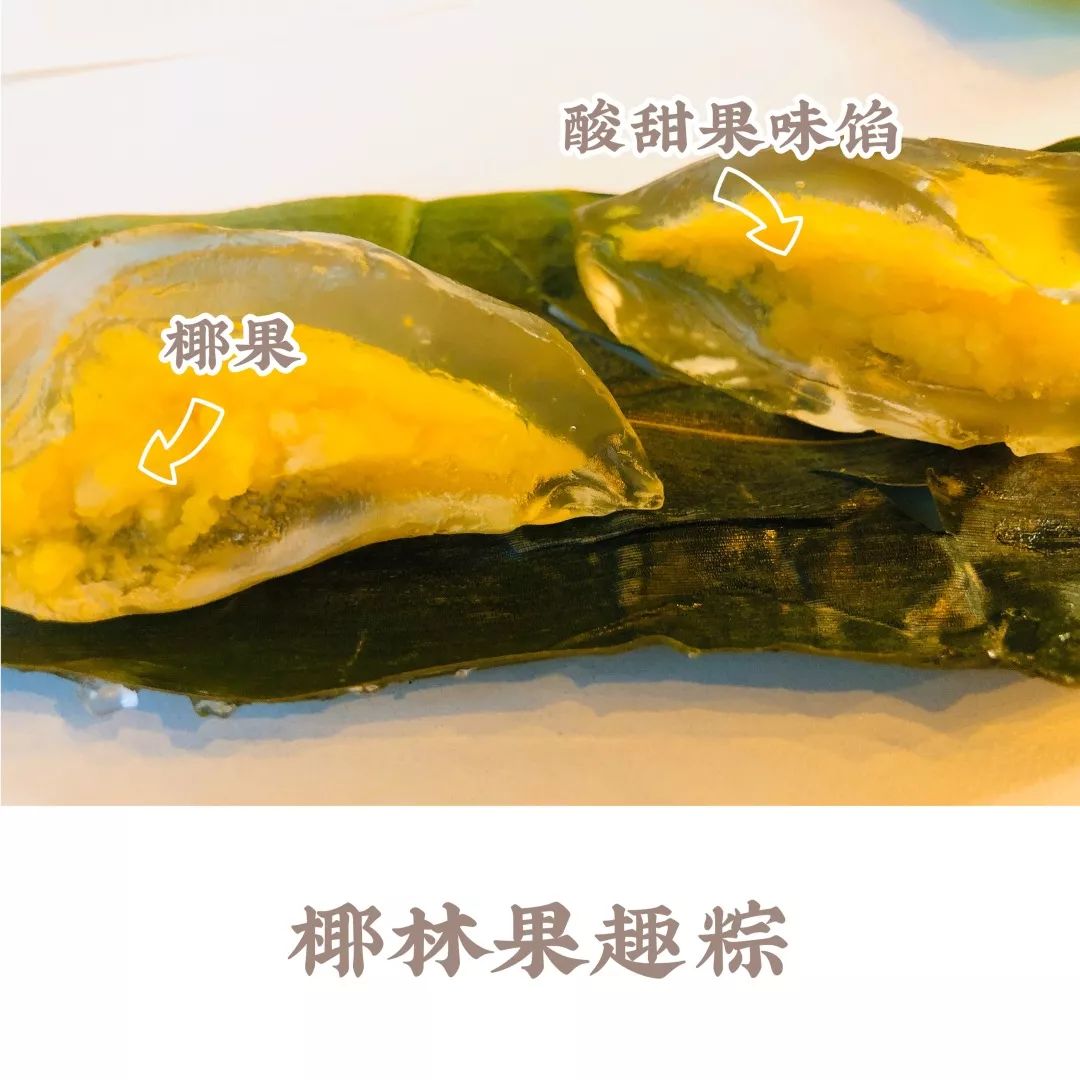 粽子是明亮的黄色,看起来像是芒果味,吃起来则只能模糊地感受到是酸甜的果味馅。馅料里藏着的椰果丰富了口感。
