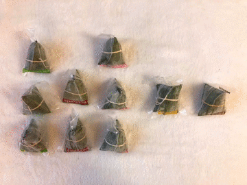 元祖龙舟粽礼盒一共有台湾风味、菌菇、紫米八宝3种口味,两甜一咸,共计9个粽子。每次剥开,都是一次小型的视觉冲击。