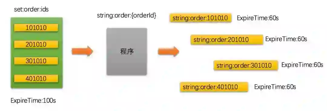 下图中的左边是一个key为Set:order:ids的Set集合,它可能是一个全量集合,也可能是某个查询条件获取出来的一个集合: