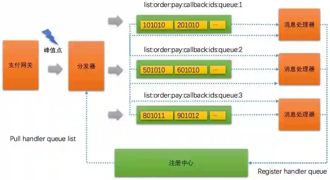 分发器是一个无状态的cluster,每个node通过向注册中心pull handler queue list,也就是获取下游处理器注册到注册中心里的消息通道。每一个分发器node会维护一个本地queue list,然后顺序推送消息到这些queue list即可。
