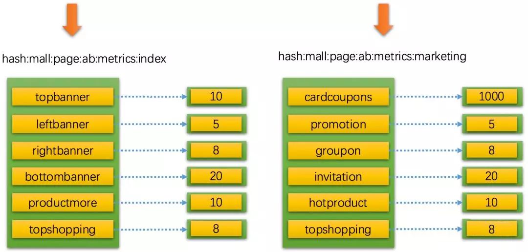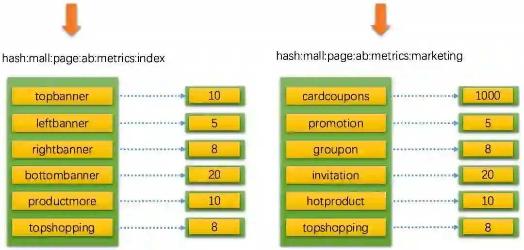 下图使用Hash数据类型来记录页面的a/bmetrics: