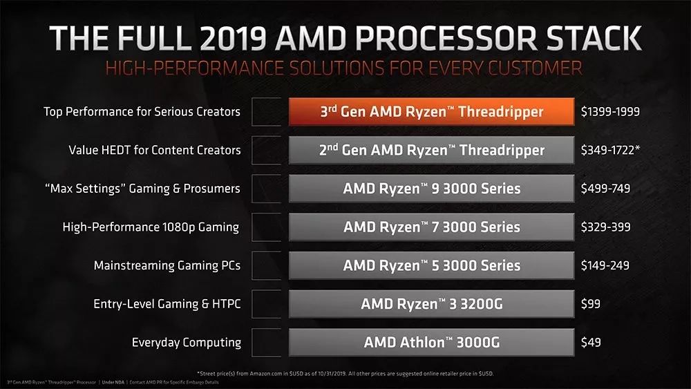 2019 年下半年,AMD 正式推出了首款面向消费者的 7nm 制程主流与高端台式机处理器三代 Ryzen 和 Ryzen Threadripper。截至目前,共有六款 Ryzen 处理器已正式开售,另有两款 Ryzen Threadripper 处理器最近已进入 HEDT 市场。以下是 AMD 2019 年三代 Ryzen 产品阵容(不包括 Ryzen 5 3400G 和 Ryzen 3 3200G):