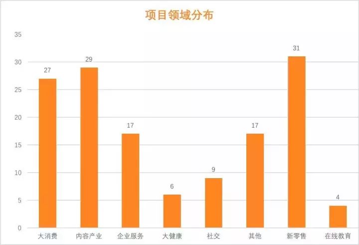最多的领域来自低启动门槛的大消费、内容产业,其次是企业服务、大健康、社交和其他: