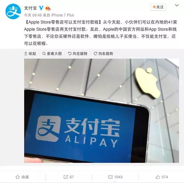 2月7日上午,支付宝官方微博称,内地的41家AppleStore零售店可用支付宝付款了。至此,Apple的中国官方网站和App Store和线下零售店,均可使用支付宝付款,甚至可以使用花呗。