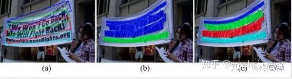 本文由旷视检测组和南京大学合作,从另一种思路去解决弯曲文字检测的问题,即像素级语义分割。考虑到基于 bounding box的方法无法很好地建模弯曲文字,语义分割方法对文字进行像素级分类,可以很容易建模弯曲文字,但是对于挨得很近的文本实例则无法区分,如下图所示。