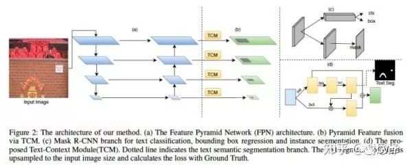 整个网络流程如下图所示,(a) 是 FPN 结构,(b) 是 text context(TCM)模块,(c) 是Mask R-CNN 的分支,(d) 是 TCM 具体的方法。