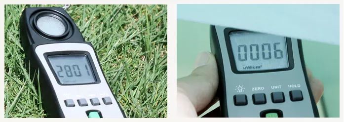 烈日下,用紫外线强度计测试伞内、伞外的紫外线,可以明显看到伞内的紫外线强度接近于无。