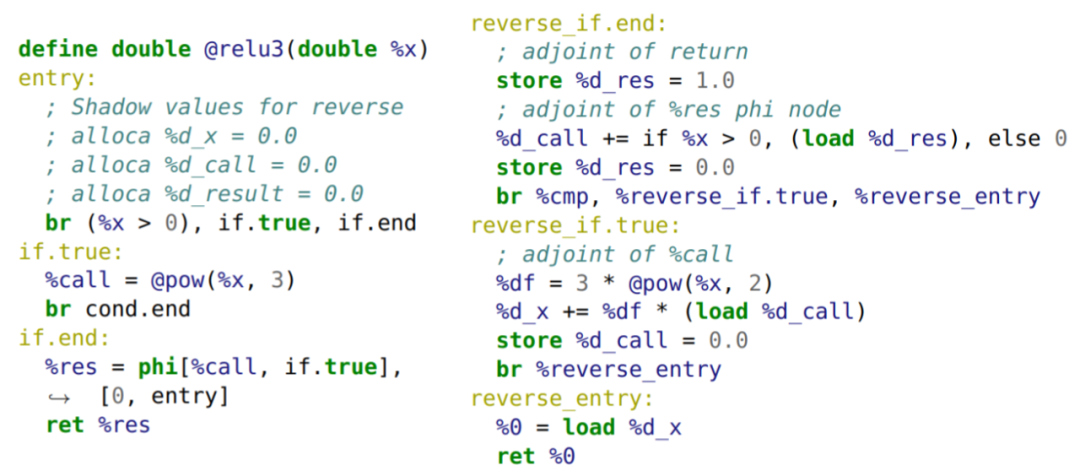 上图为 relu(pow(x,3)) 的梯度合成示例。左侧为 LLVM IR 上的原始计算。左侧注释中展示了将添加到前向传递中的活动变量的影子分配。右侧则是 Enzyme 将生成的反向传递。完整的合成梯度函数将结合使用这些函数(添加影子分配),将 if.end 中的返回替换为 reverse_if.end 的分支。