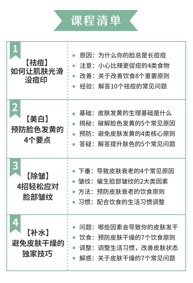 和以往的小讲课有所不同,这次课程总共分为四个部分,它不是简单的复制一套所谓“标准食谱”给你,而是从日常护肤和饮食中看不见的误区着手,帮助你养成科学、系统的饮食保养方法。