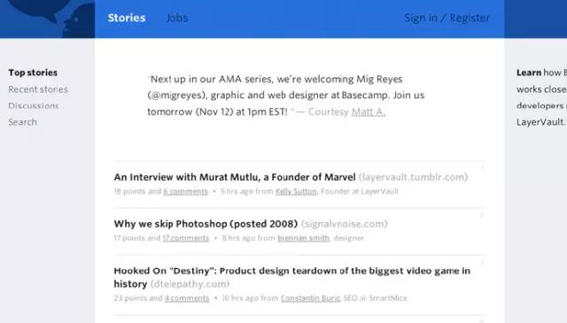用户协助传播内容的形式很利于你发现新博客或新网站。到Hacker News或是你所感兴趣的领域里的Reddit类网站当中看看哪些域名下的文章是一直被广大用户提交和点赞的,你有可能探索到很不错的内容来源。此外,在很多论坛或社交网站当中也会有用户推荐优质的内容资源。只要是能引发自己兴趣的内容,就尽量去读,尽量去接纳各种观点;此外记得多做书签。