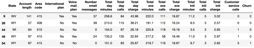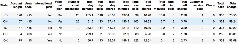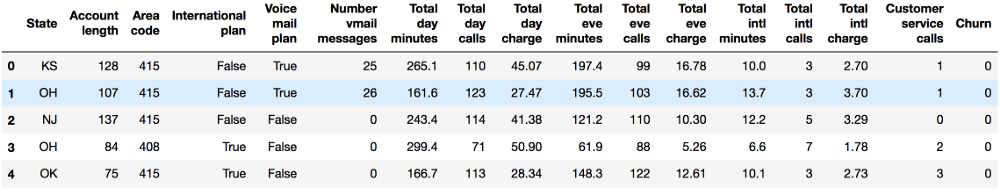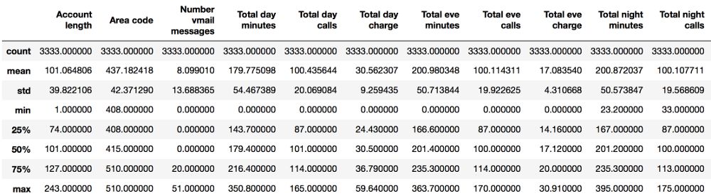 bool、int64、float64和object是我们特征的数据类型。这一方法同时也会显示是否有缺失的值。在上面的例子中答案是没有缺失,因为每列都包含3333个观测,和我们之前使用shape方法得到的数字是一致的。
