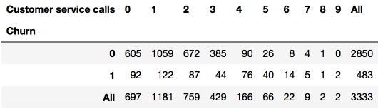 因此,预测客户呼叫客服超过3次,且已开通国际套餐的情况下会离网(Churn=1),我们可以期望的精确度为85.8%的精确度(我们只有464+9次弄错了)。我们基于非常简单的推理得到的数字85.8%,可以作为一个良好的开端(我们即将创建的更多机器学习模型的基线)。