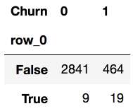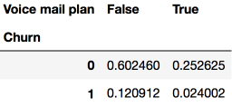 假设我们想知道样本的Churn(离网)和International plan(国际套餐)的分布,我们可以使用crosstab方法构建一个列联表(contingency table):