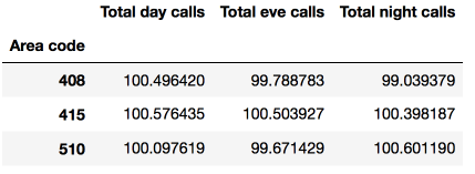 df.pivot_table(['Total day calls', 'Total eve calls', 'Total night calls'], ['Area code'], aggfunc='mean')