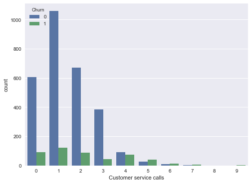 sns.countplot(x='Customer service calls', hue='Churn', data=df);