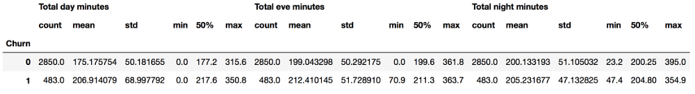 df.groupby(['Churn'])[columns_to_show].describe(percentiles=[])